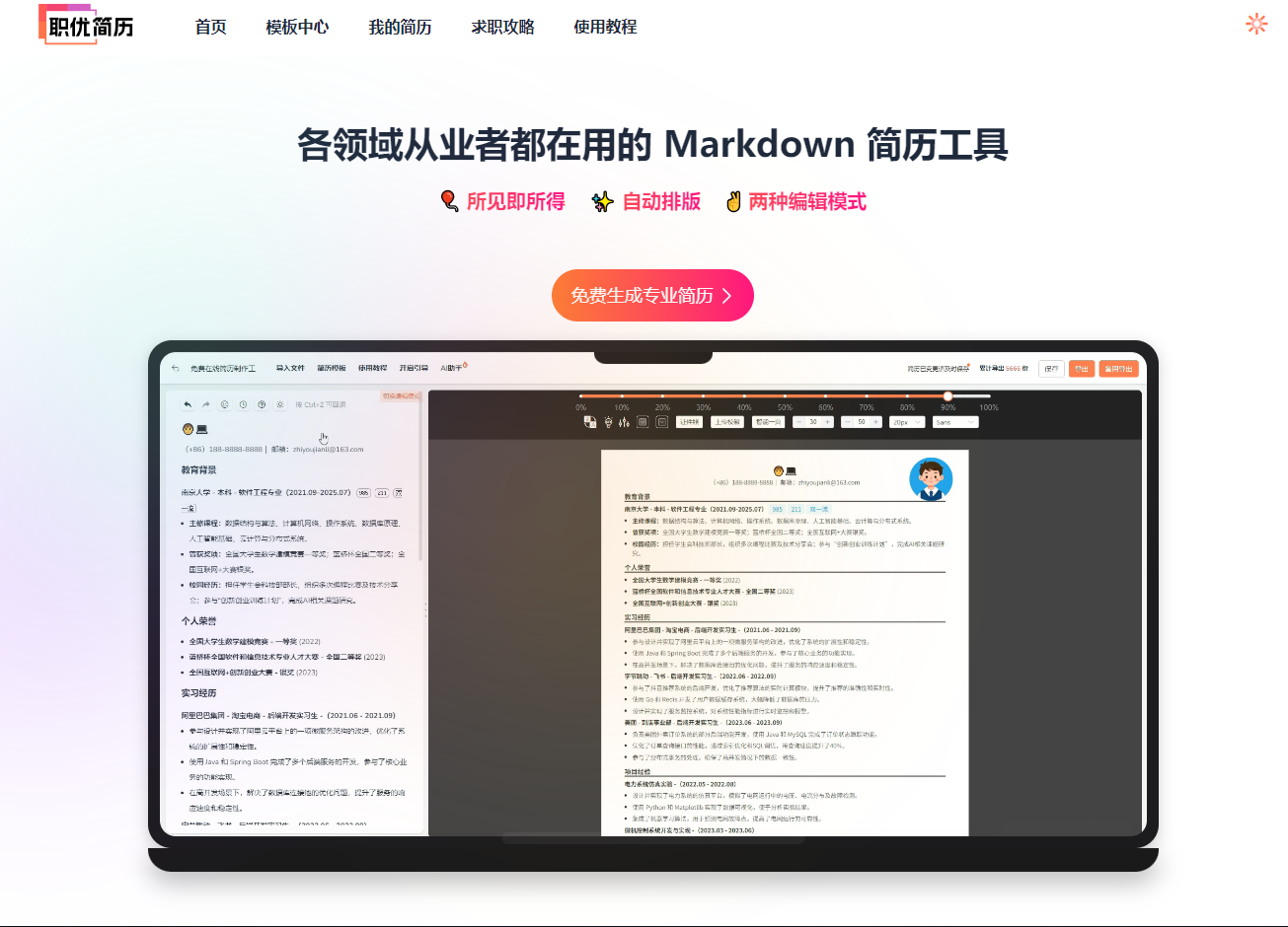 还在为简历排版头秃?为找不到合适模板焦虑?免费又专业的在线 Markdown 简历制作工具,小白也能轻松搞定高分简历!一款专注于互联网从业者的免费简历制作工具,海量简历模板免费使用,免费导出pdf/png/md格式简历,免费照,内置ai简历助手,一键快速生成简洁大方的高分简历!